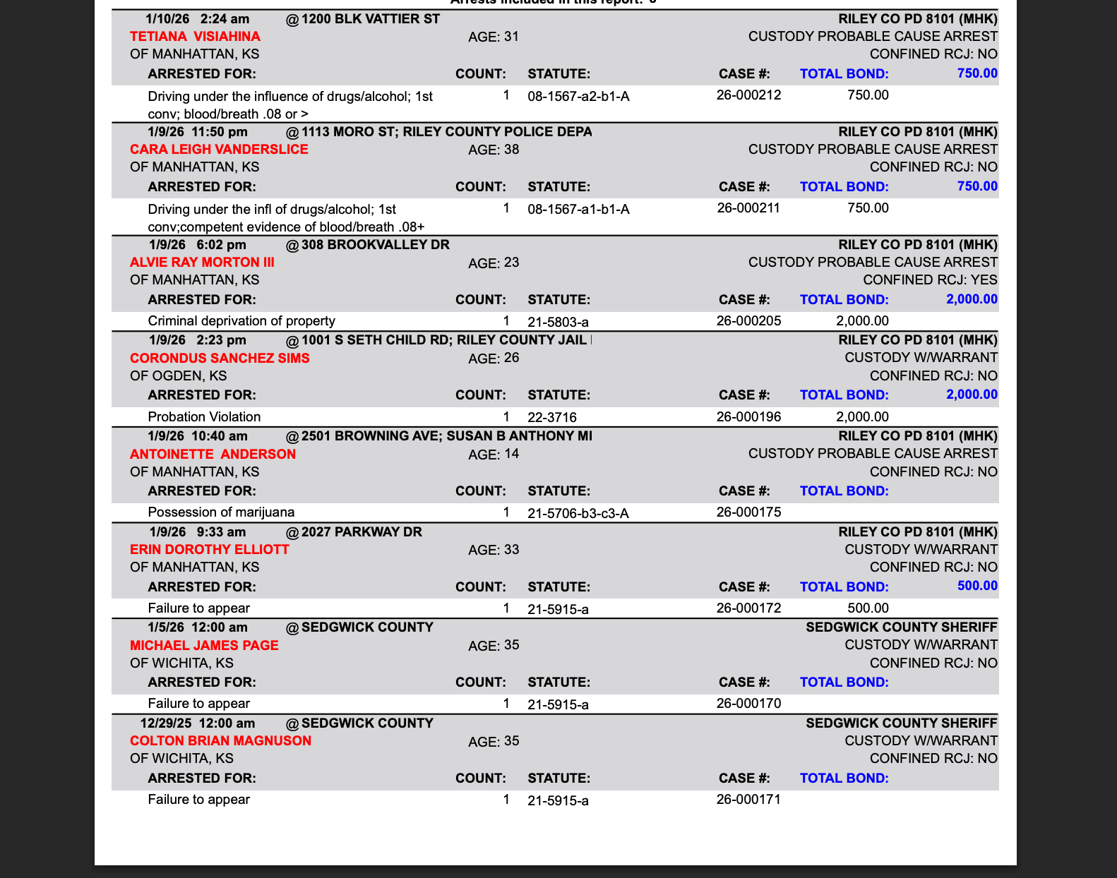 The following is a summary of arrests, citations by the Riley County Police Department. Those arrested are presumed innocent until proven guilty in a court of law.