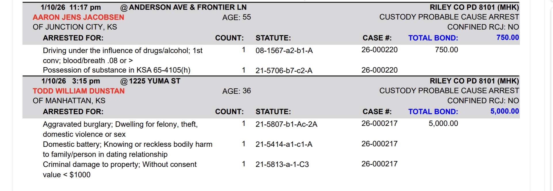 Riley County Arrest Report January 10, 11