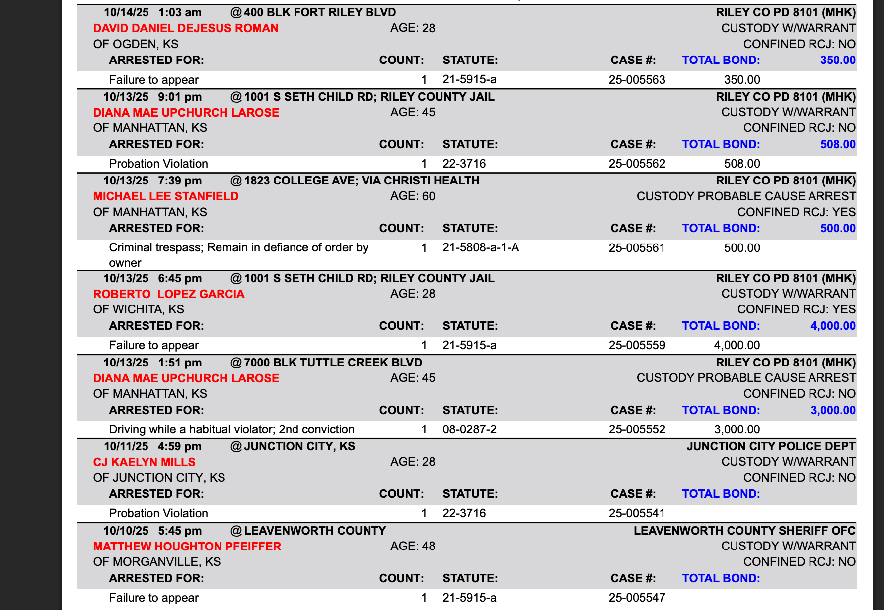 The following is a summary of arrests, citations by the Riley County Police Department. Those arrested are presumed innocent until proven guilty in a court of law.