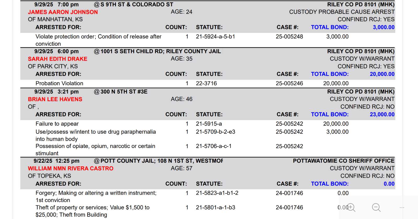 The following is a summary of arrests, citations by the Riley County Police Department. Those arrested are presumed innocent until proven guilty in a court of law.