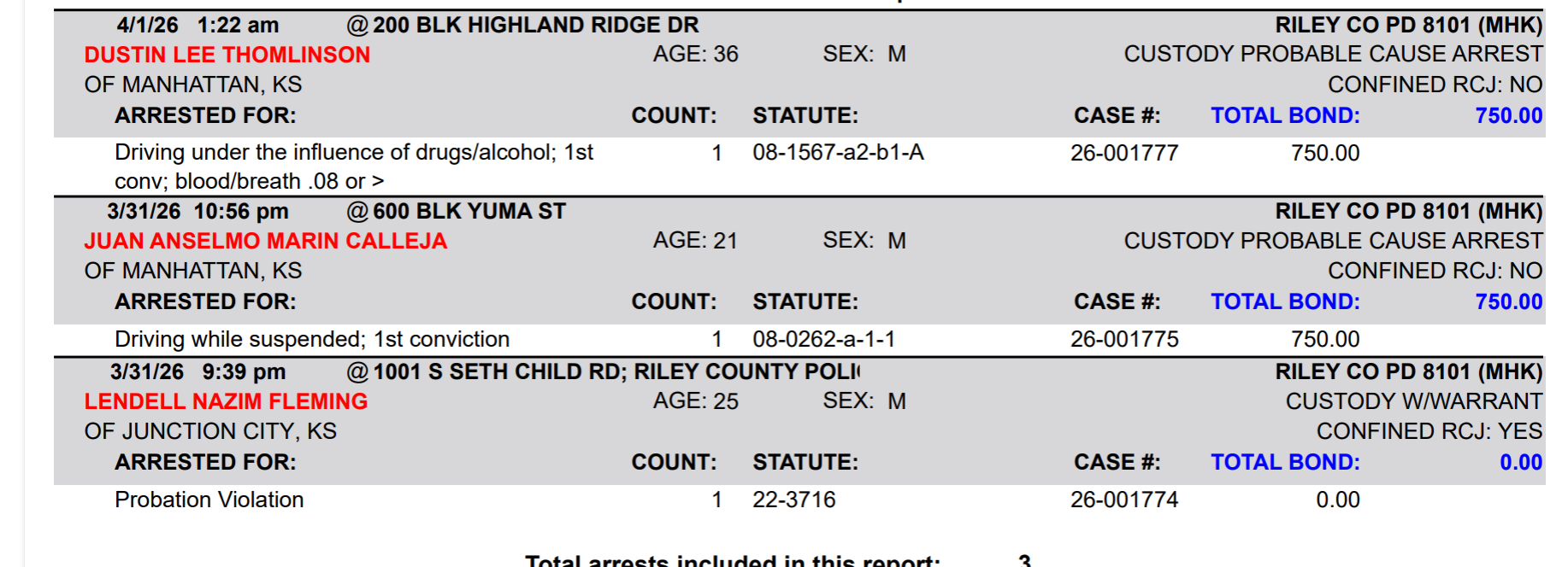 Riley County Arrest Report April 1