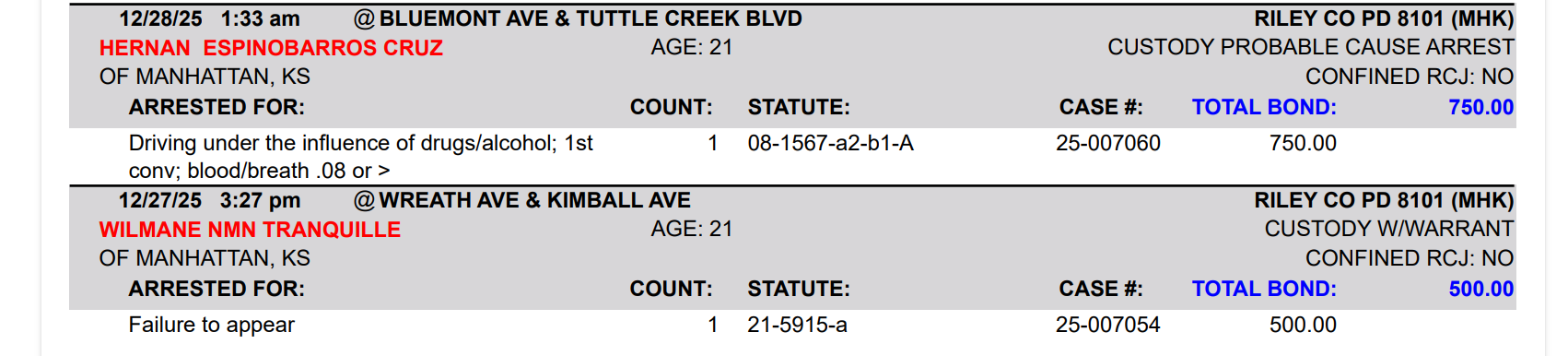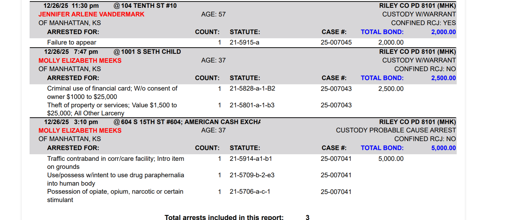 The following is a summary of arrests, citations by the Riley County Police Department. Those arrested are presumed innocent until proven guilty in a court of law.