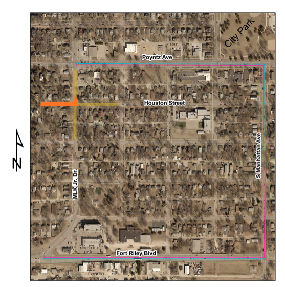 Emergency access onto Houston Street, west of Martin Luther King Jr. Drive, will only be available from the south. Please see map below for detour routing (magenta and cyan arrows). For those who regularly travel on Martin Luther King Jr. Drive, we recommend diverting on either Fort Riley Boulevard or Poyntz Avenue to South Manhattan Avenue instead during this construction closure.