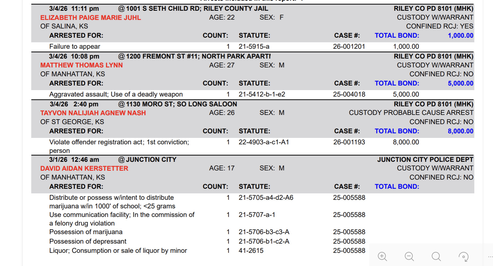 The following is a summary of arrests, citations by the Riley County Police Department. Those arrested are presumed innocent until proven guilty in a court of law.