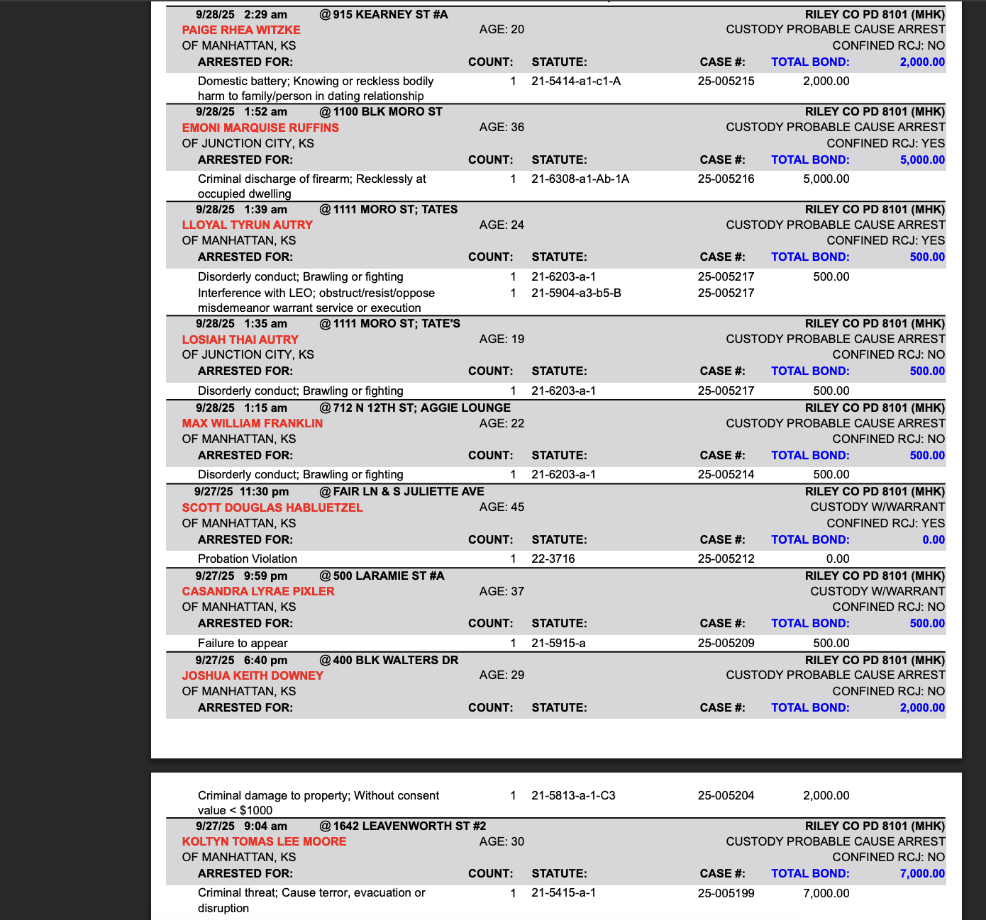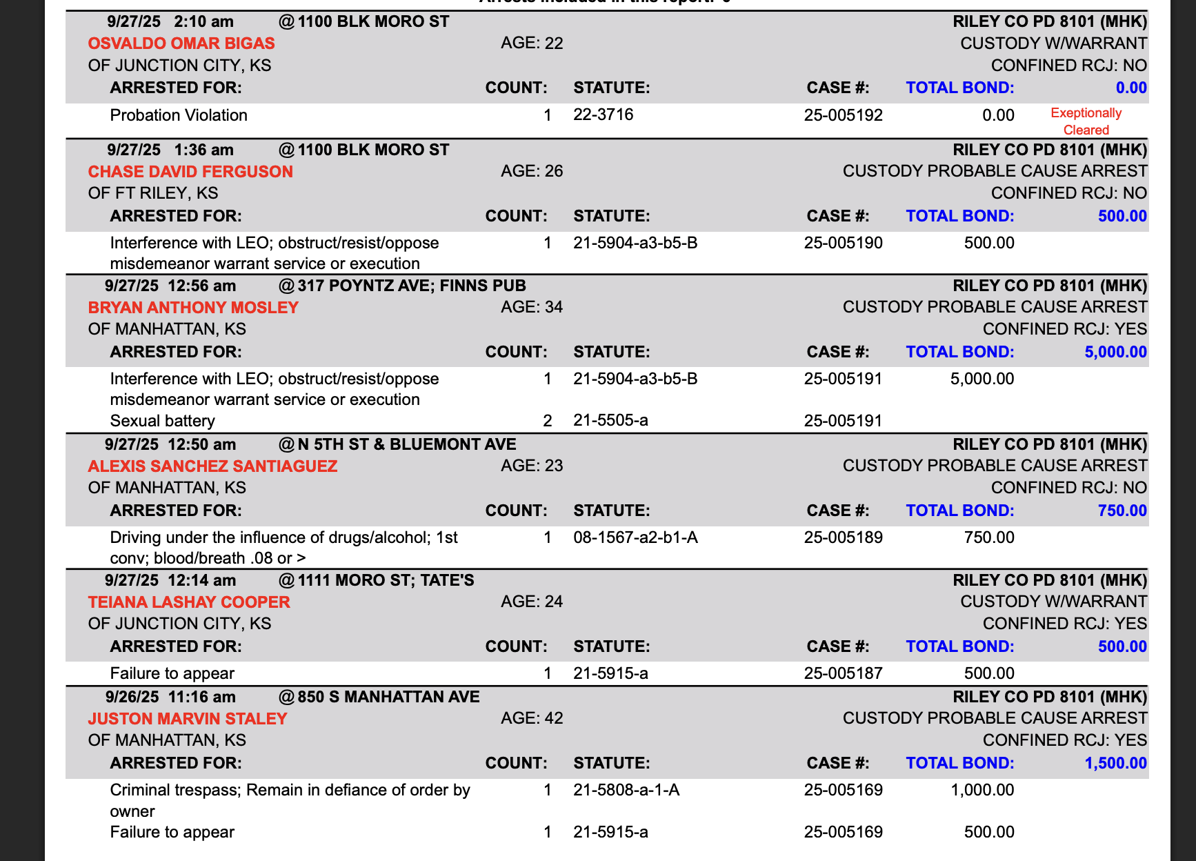 The following is a summary of arrests, citations by the Riley County Police Department. Those arrested are presumed innocent until proven guilty in a court of law.