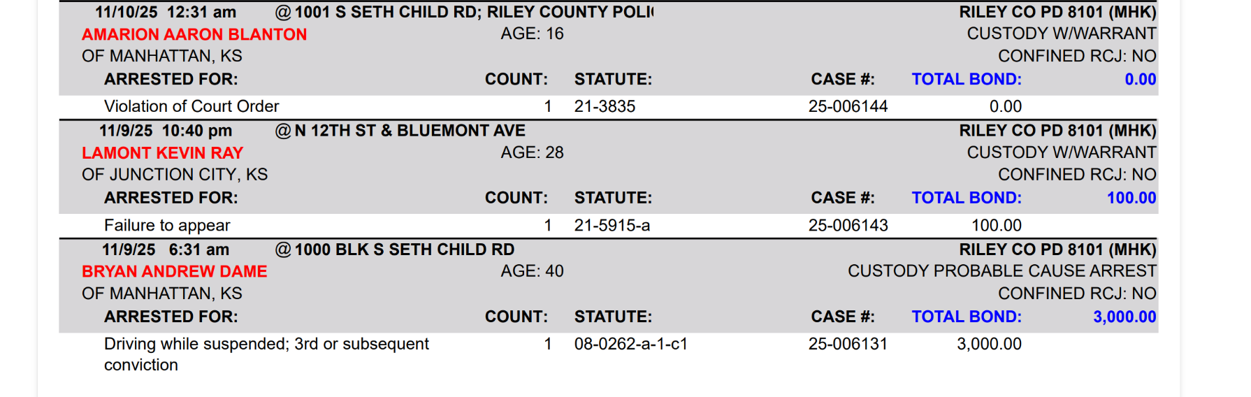 The following is a summary of arrests, citations by the Riley County Police Department. Those arrested are presumed innocent until proven guilty in a court of law.