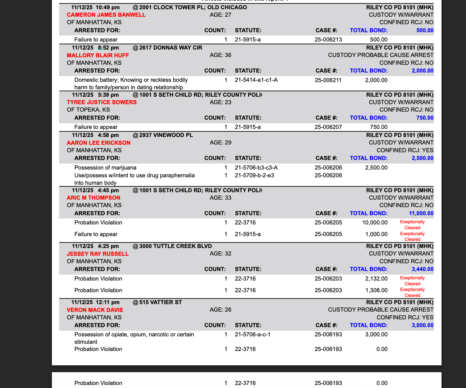 The following is a summary of arrests, citations by the Riley County Police Department. Those arrested are presumed innocent until proven guilty in a court of law.