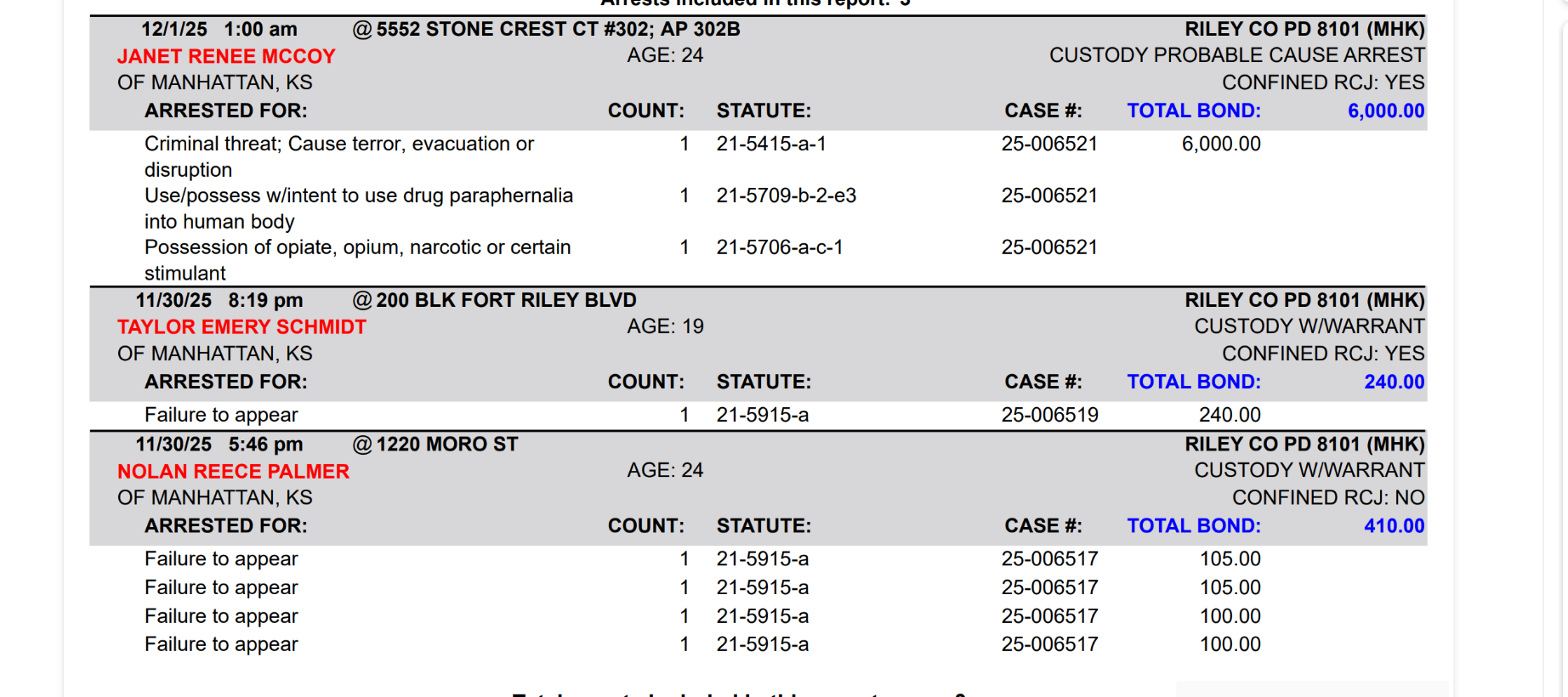 The following is a summary of arrests, citations by the Riley County Police Department. Those arrested are presumed innocent until proven guilty in a court of law.