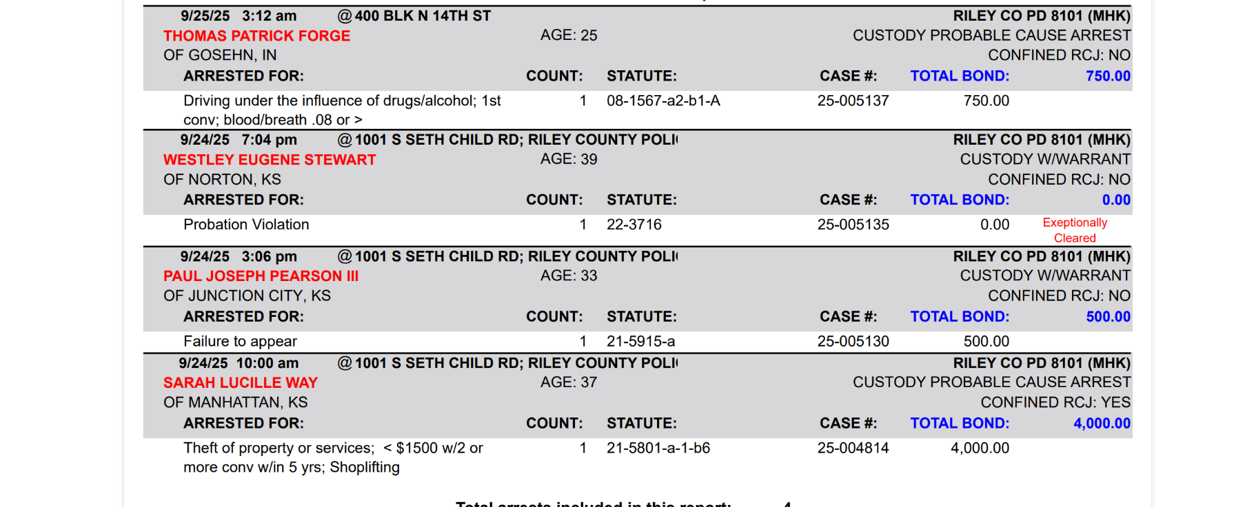 The following is a summary of arrests, citations by the Riley County Police Department. Those arrested are presumed innocent until proven guilty in a court of law.