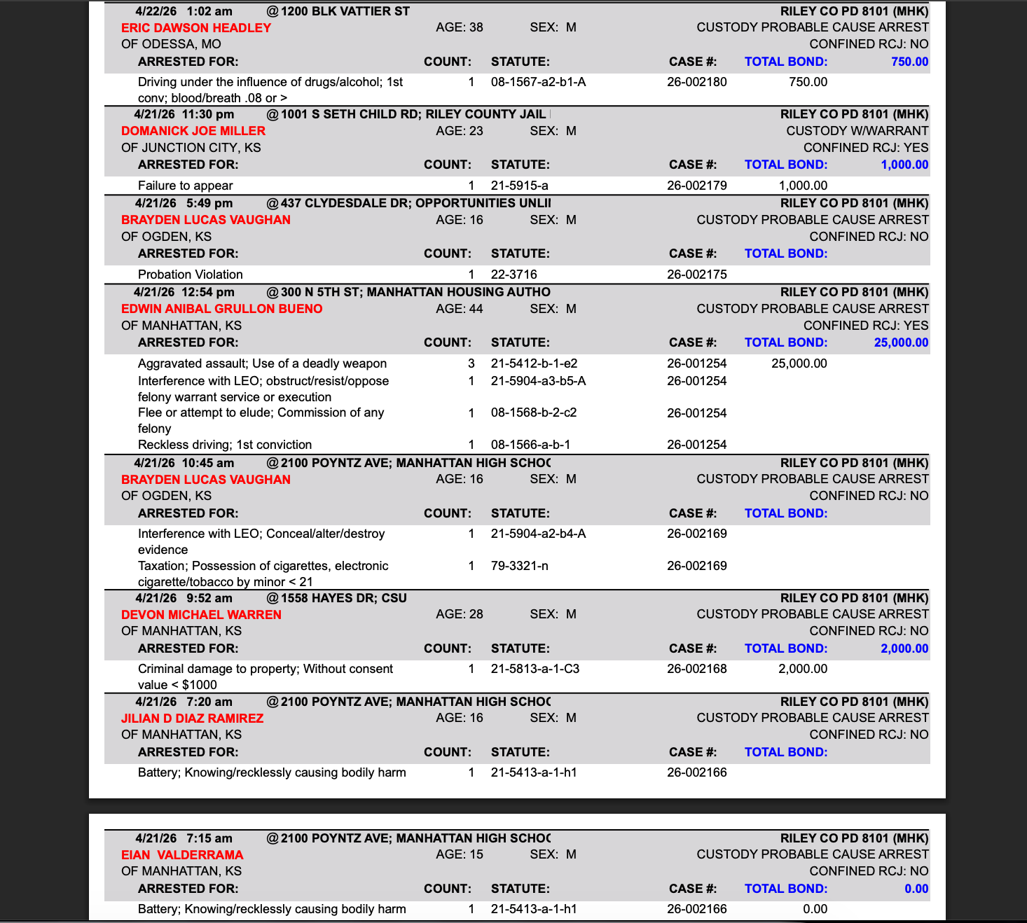The following is a summary of arrests, citations by the Riley County Police Department. Those arrested are presumed innocent until proven guilty in a court of law.