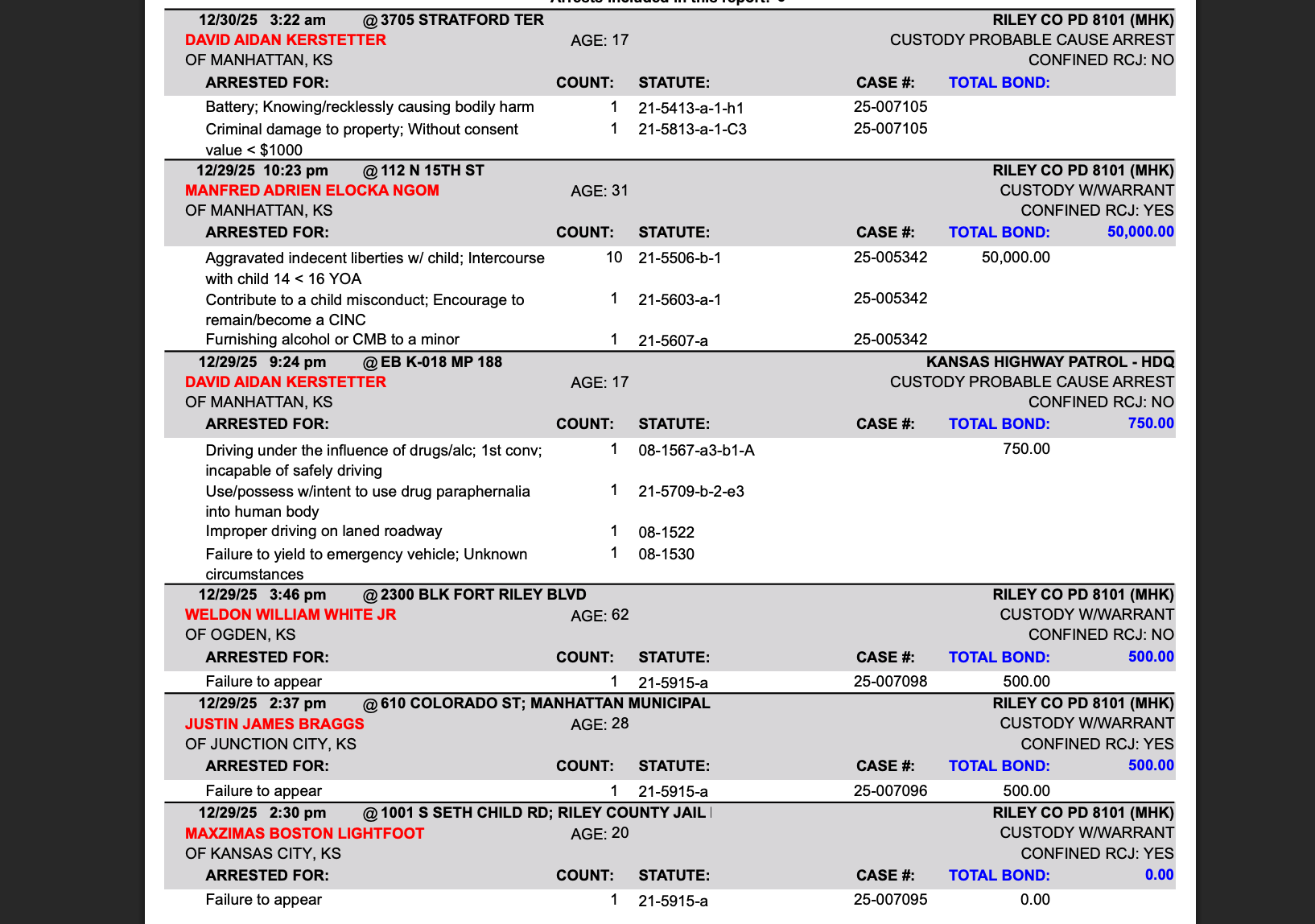 Riley County Arrest Report December 30