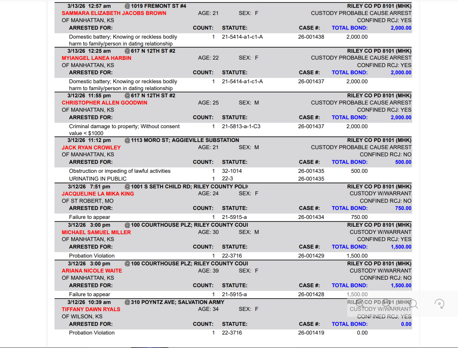 The following is a summary of arrests, citations by the Riley County Police Department. Those arrested are presumed innocent until proven guilty in a court of law.