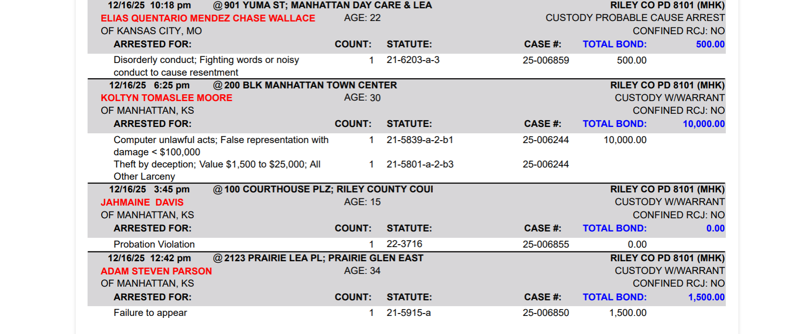 The following is a summary of arrests, citations by the Riley County Police Department. Those arrested are presumed innocent until proven guilty in a court of law.