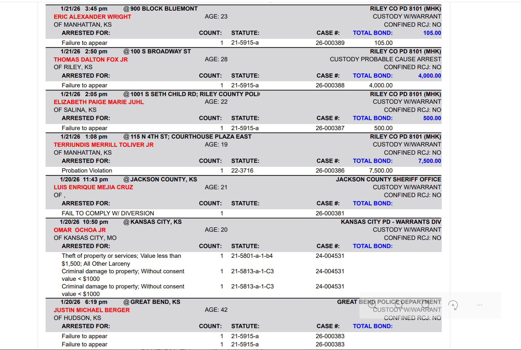 Riley County Arrest Report January 22