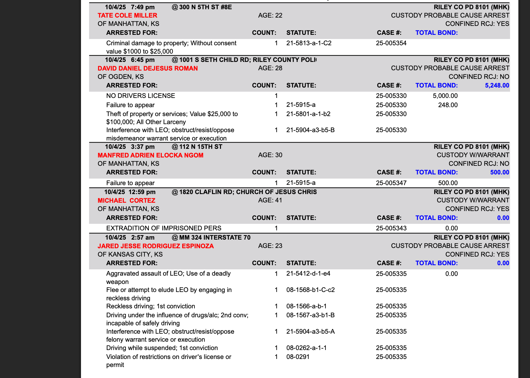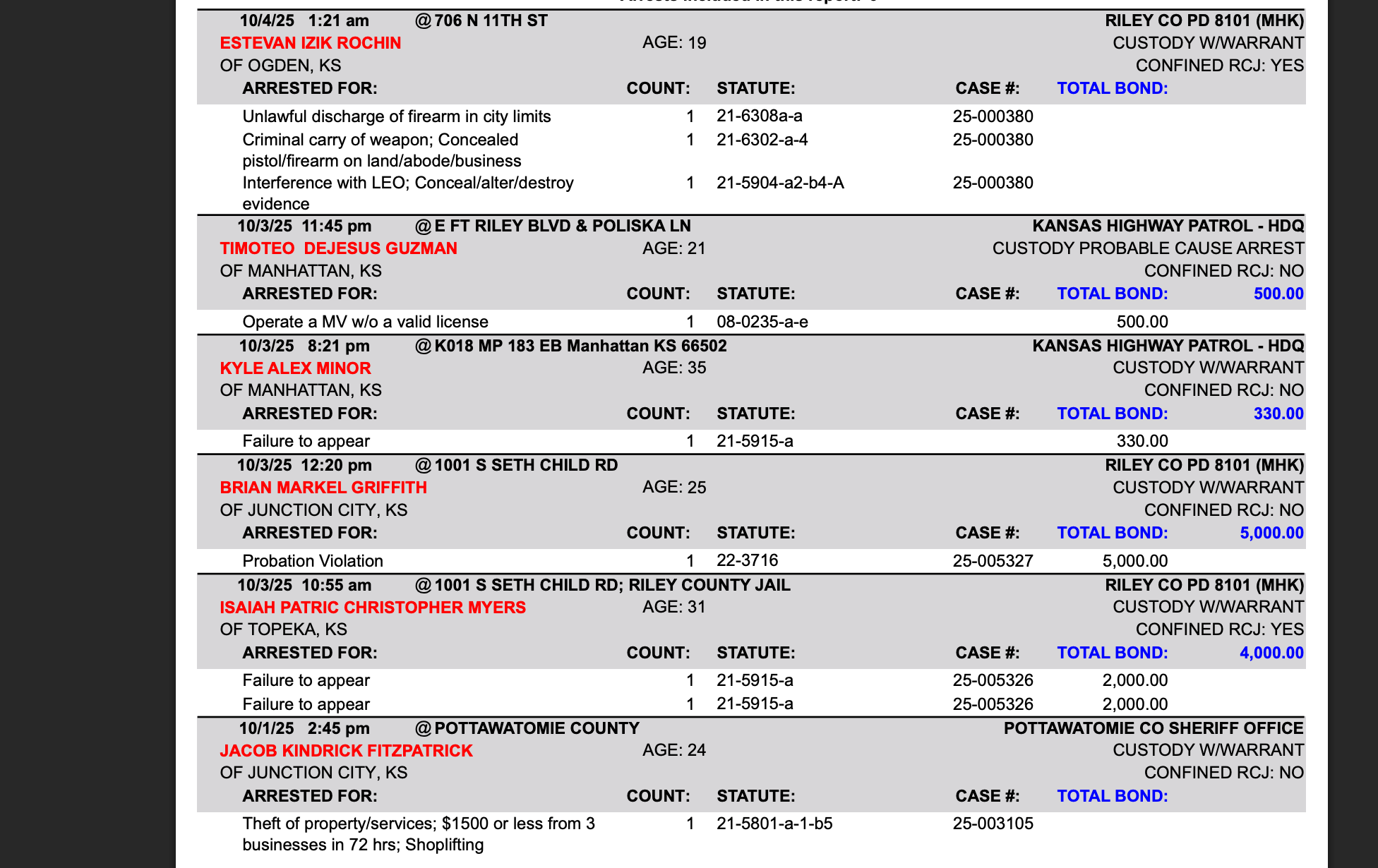The following is a summary of arrests, citations by the Riley County Police Department. Those arrested are presumed innocent until proven guilty in a court of law.