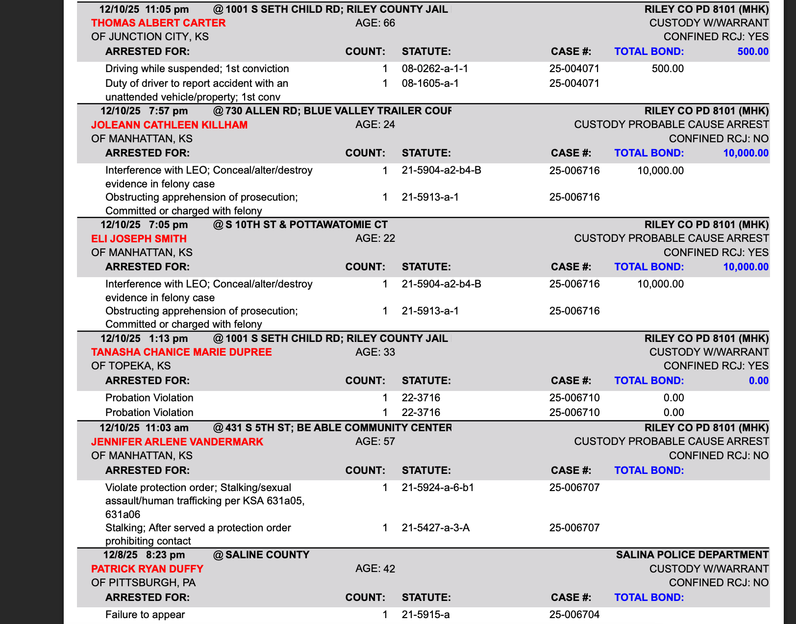 The following is a summary of arrests, citations by the Riley County Police Department. Those arrested are presumed innocent until proven guilty in a court of law.