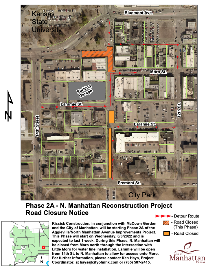 West Laramie Street will reopen from 14th Street to North Manhattan to allow for access onto Moro Street. Primary access to the Aggieville Garage still will be from 14th Street via West Laramie, but traffic will be temporarily able to leave and proceed east.