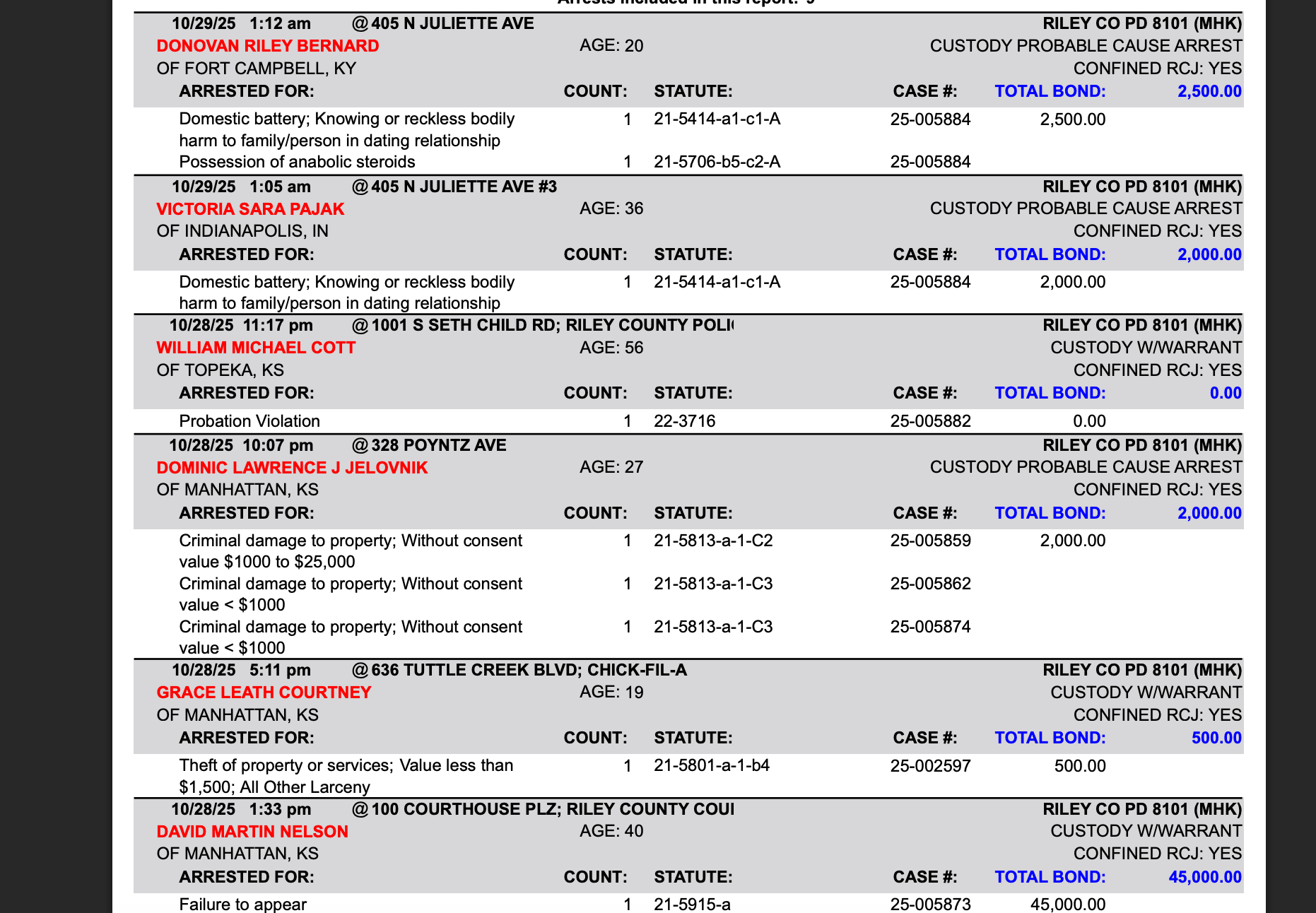 The following is a summary of arrests, citations by the Riley County Police Department. Those arrested are presumed innocent until proven guilty in a court of law.