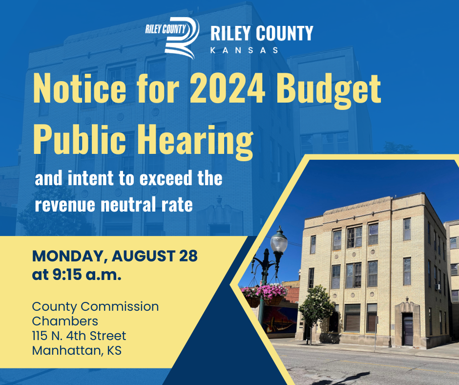 The Riley County RNR public hearing is scheduled for Monday, August 28 at 9:15 a.m. in the Riley County Commission Chambers. Find more information about Revenue Neutral Rate requirements, as well as the schedule of public hearings for all taxing authorities in Riley County at www.rileycountyks.gov/rnr