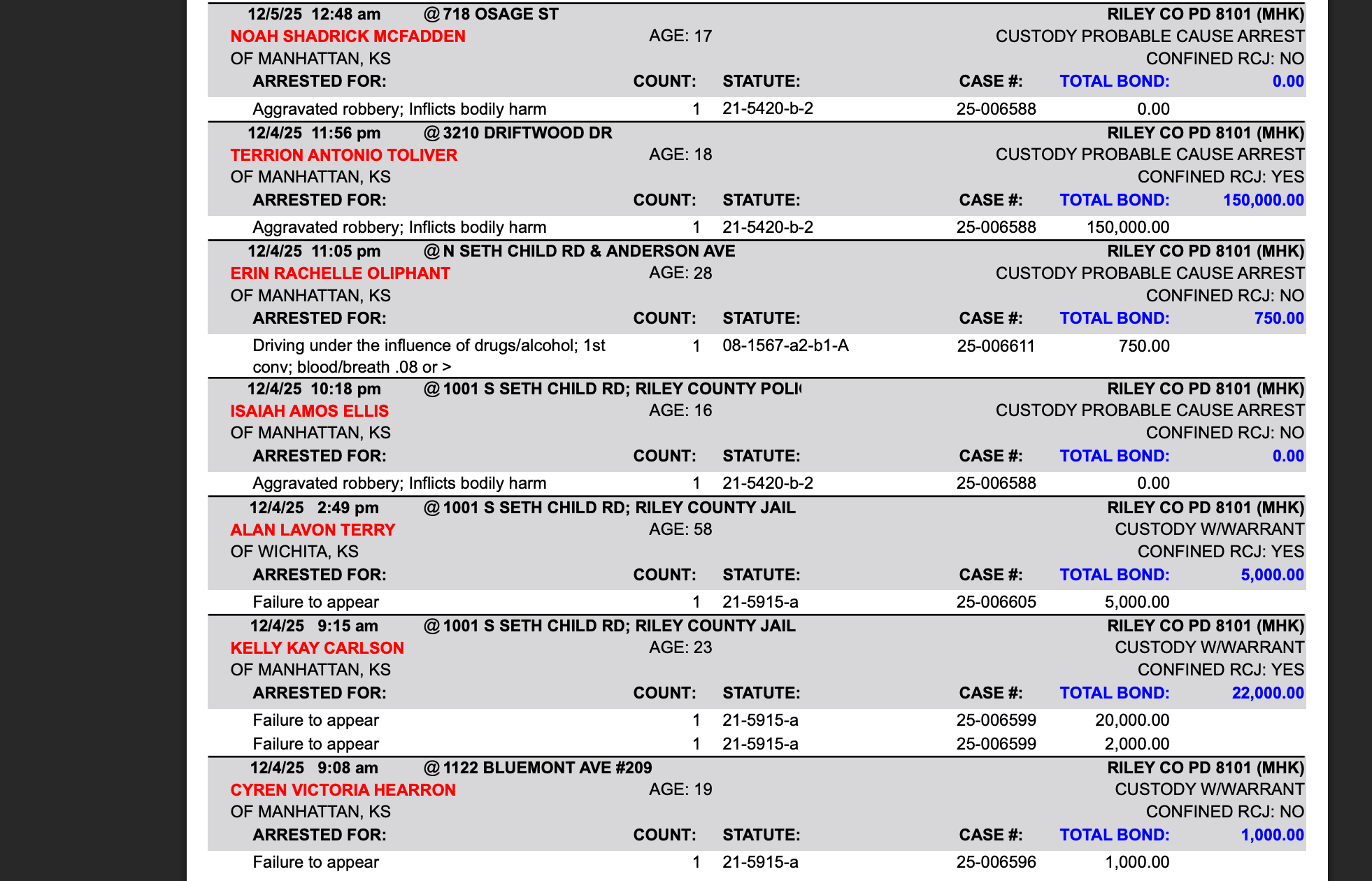 The following is a summary of arrests, citations by the Riley County Police Department. Those arrested are presumed innocent until proven guilty in a court of law.
