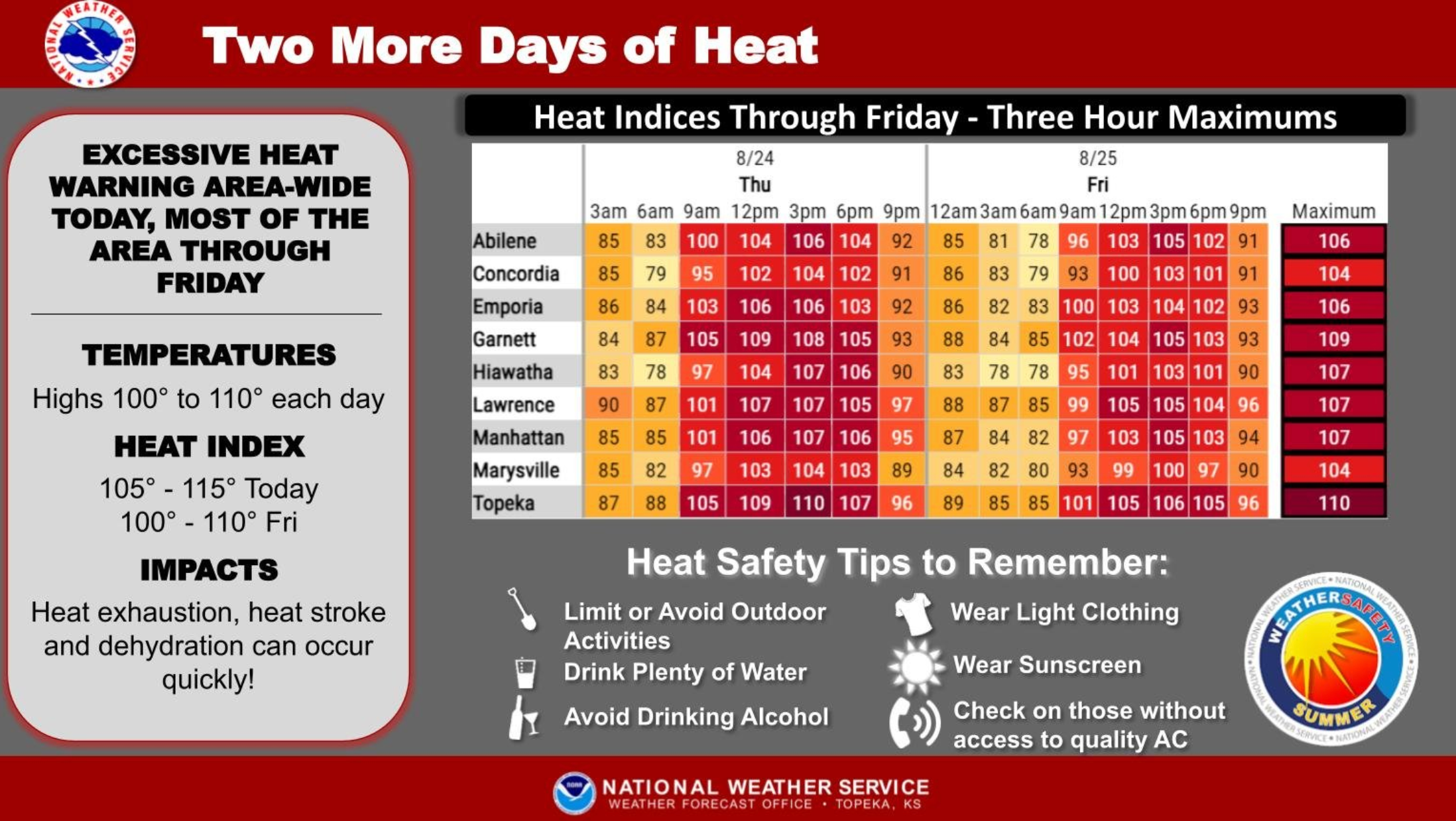Heat indices again reach 105-115 degrees Thursday then 100-110 degrees Friday. Good news is there is light at the end of the tunnel, as a cold front Friday night brings cooler temps this weekend. 80s by Sunday! There are also some storm chances Friday night into Saturday.