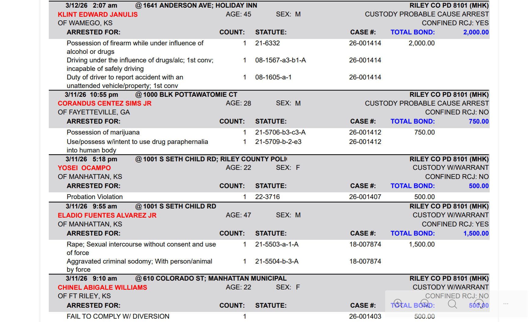 Riley County Arrest Report March 12