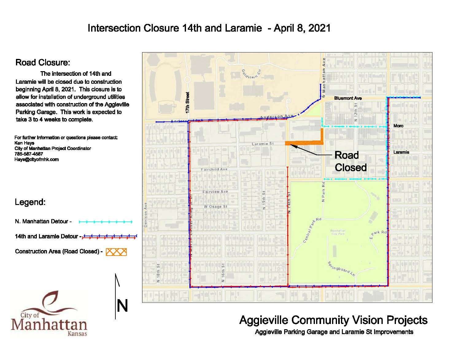 According to the Manhattan City officials work on intersection closure and detours for Laramie St & 14th St, are beginning Wednesday. This work is expected to take approximately 4 weeks.