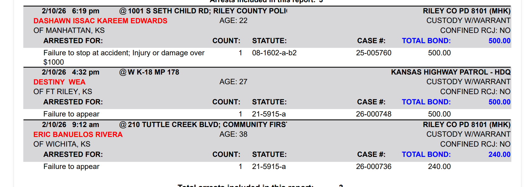 The following is a summary of arrests, citations by the Riley County Police Department. Those arrested are presumed innocent until proven guilty in a court of law.
