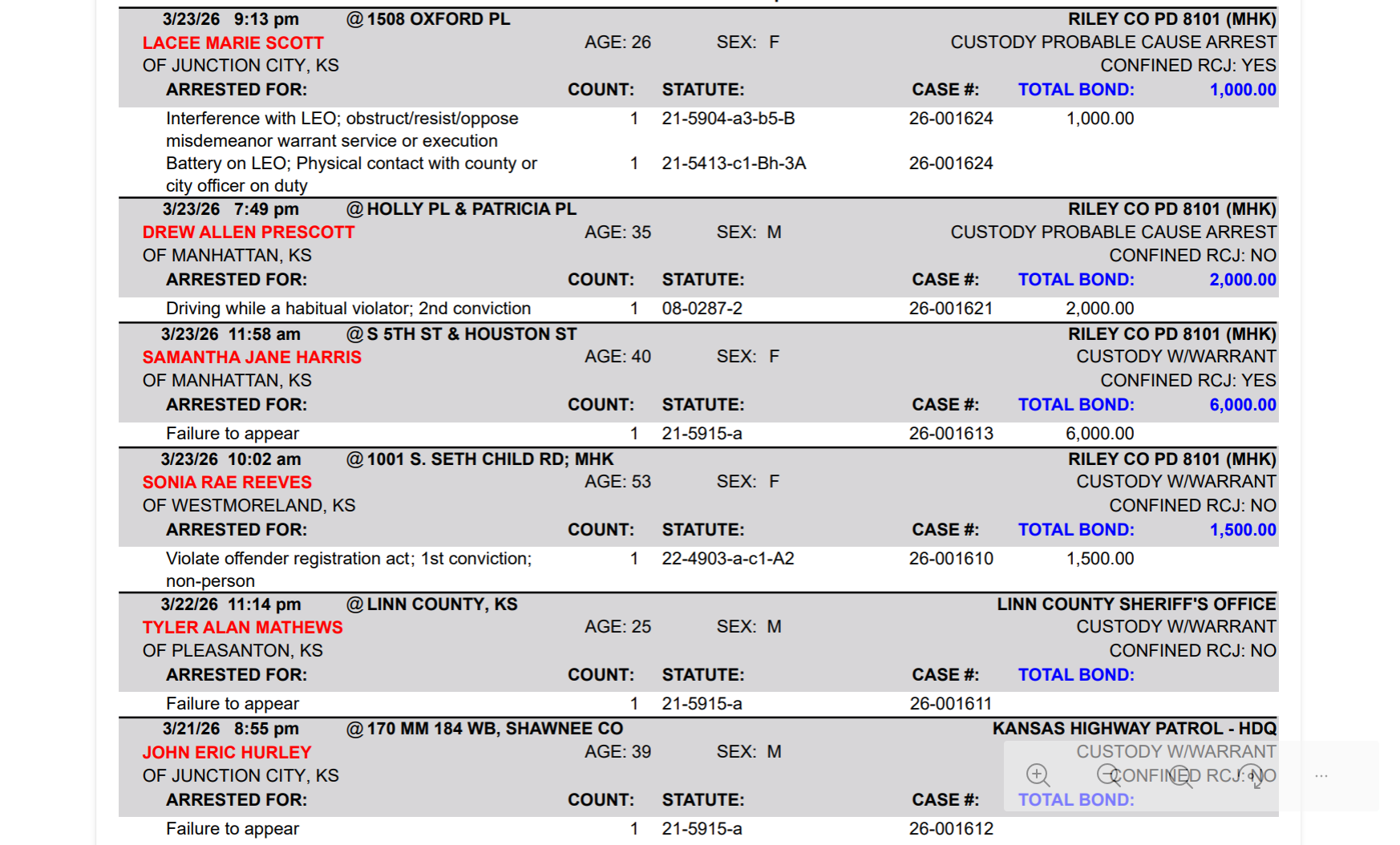 The following is a summary of arrests, citations by the Riley County Police Department. Those arrested are presumed innocent until proven guilty in a court of law.