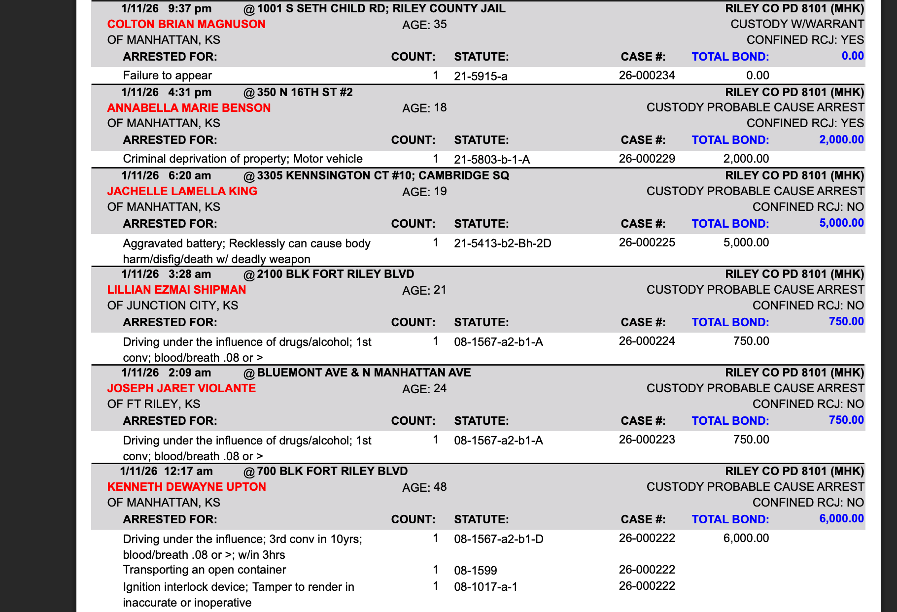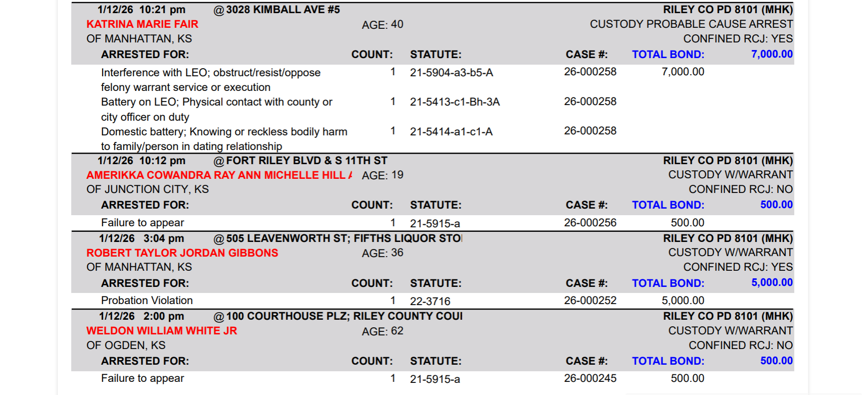 Riley County Arrest Report January 12, 13