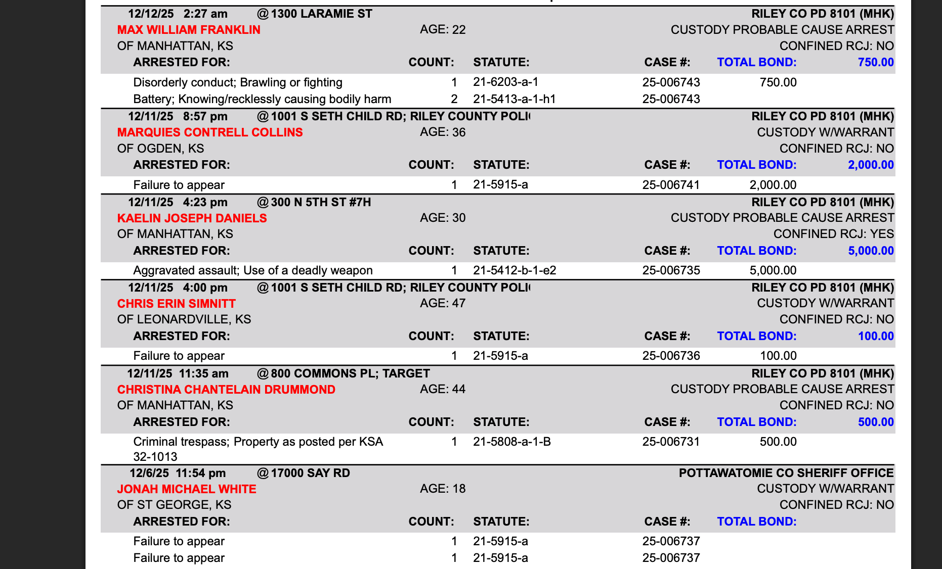 The following is a summary of arrests, citations by the Riley County Police Department. Those arrested are presumed innocent until proven guilty in a court of law.