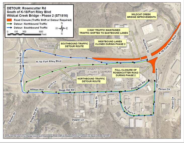 The detour (see map below) from K-18 to Rosencutter Road uses Seth Child Road, Allison Avenue, Stagg Hill Road and Sky-Vue Lane. Richards Drive will remain open in both directions on K-18. Poliska Lane will remain open, however, only right-in and right-out turns will be allowed. Same for the entrance across from Poliska Lane.