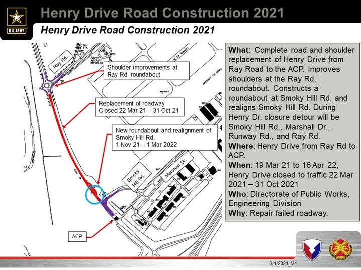 Henry ACP will remain open during the entire project, but there could be intermittent lane closures at the ACP. During the closure traffic will be rerouted around the airfield via Smokey Hill Road, Marshall Drive, Runway Road and Ray Road.