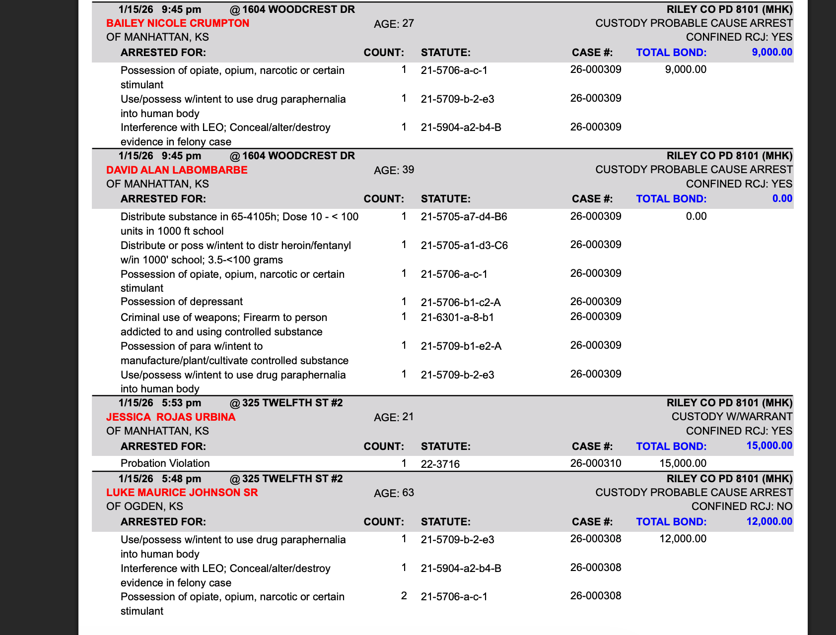 The following is a summary of arrests, citations by the Riley County Police Department. Those arrested are presumed innocent until proven guilty in a court of law.