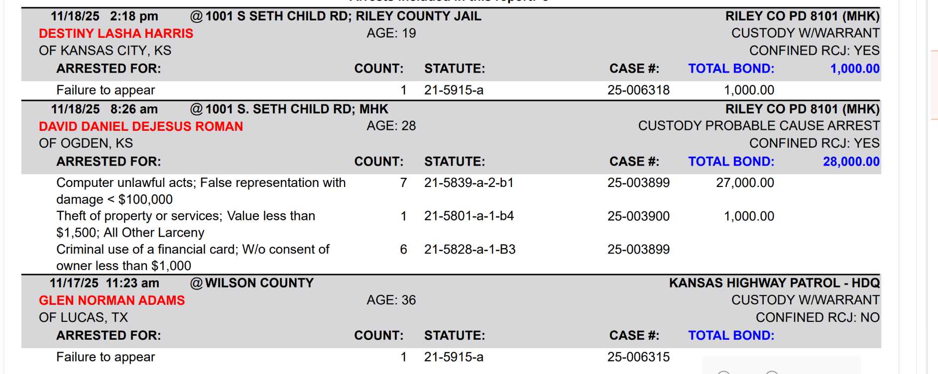 The following is a summary of arrests, citations by the Riley County Police Department. Those arrested are presumed innocent until proven guilty in a court of law.