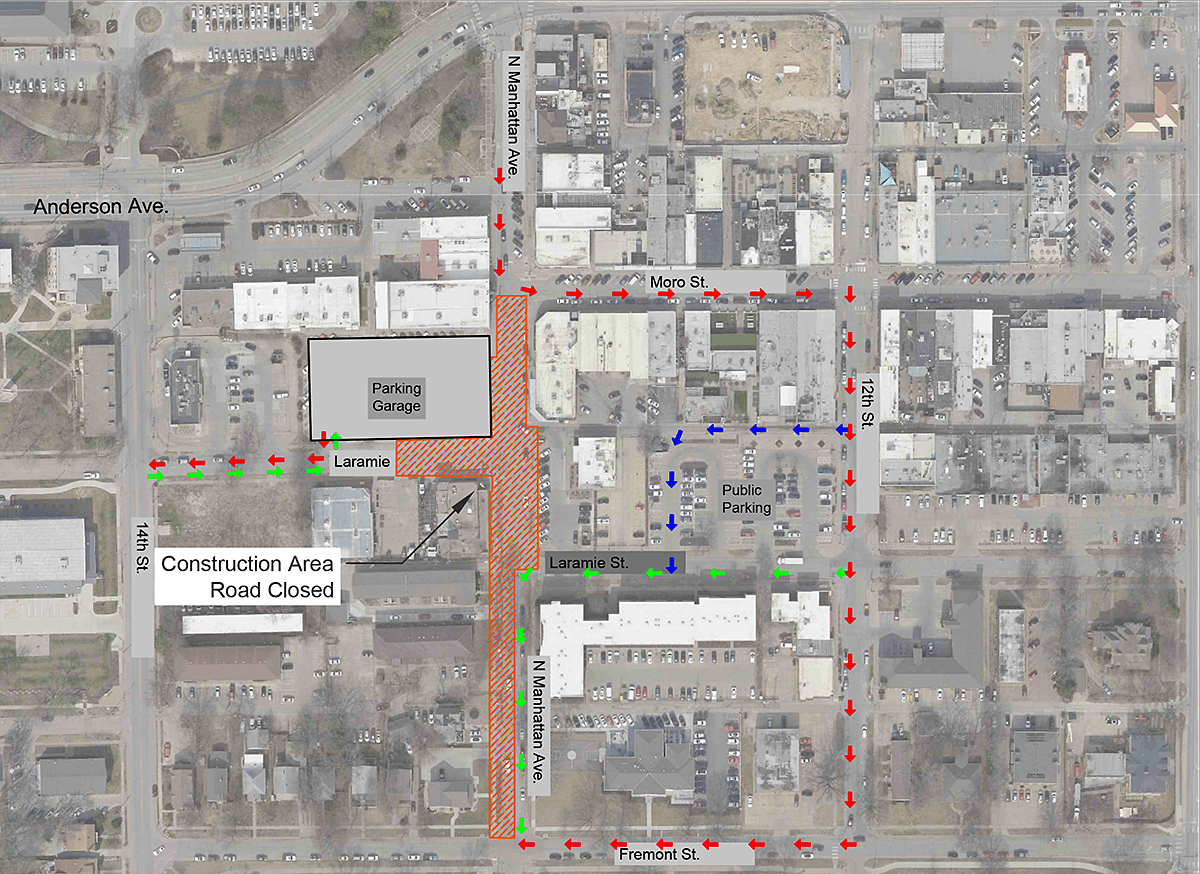 The first phase of this construction project will be from Fremont north to Moro. The attached map shows available routes and detours around the construction area to main access to Aggieville and the recently opened Parking Garage. During this phase, the Aggieville Parking Garage will be accessible only via the intersection of 14th Street and Laramie. The public parking lot north of Laramie Street will remain open to the public and is accessible from 12th Street.