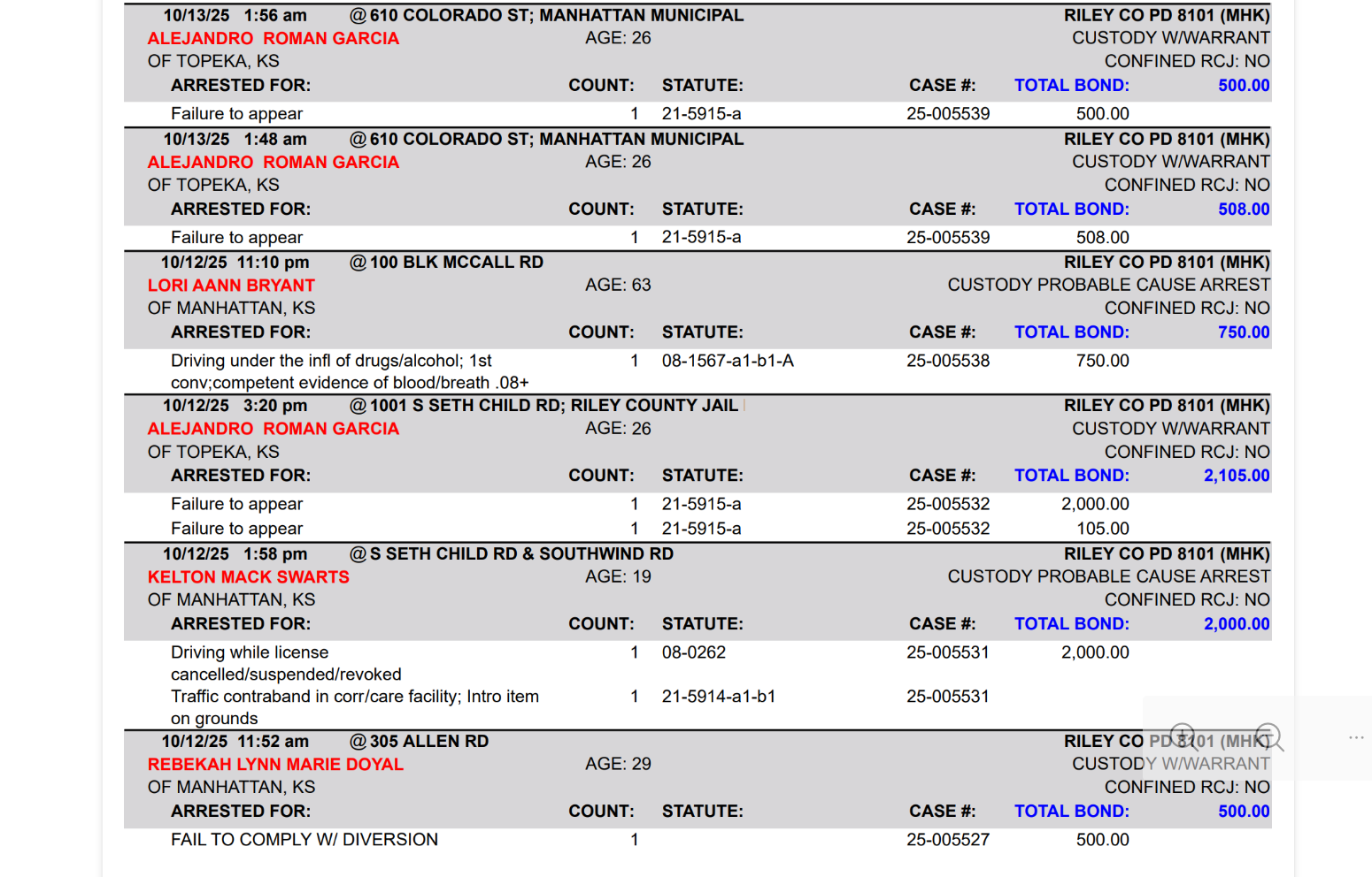 The following is a summary of arrests, citations by the Riley County Police Department. Those arrested are presumed innocent until proven guilty in a court of law.